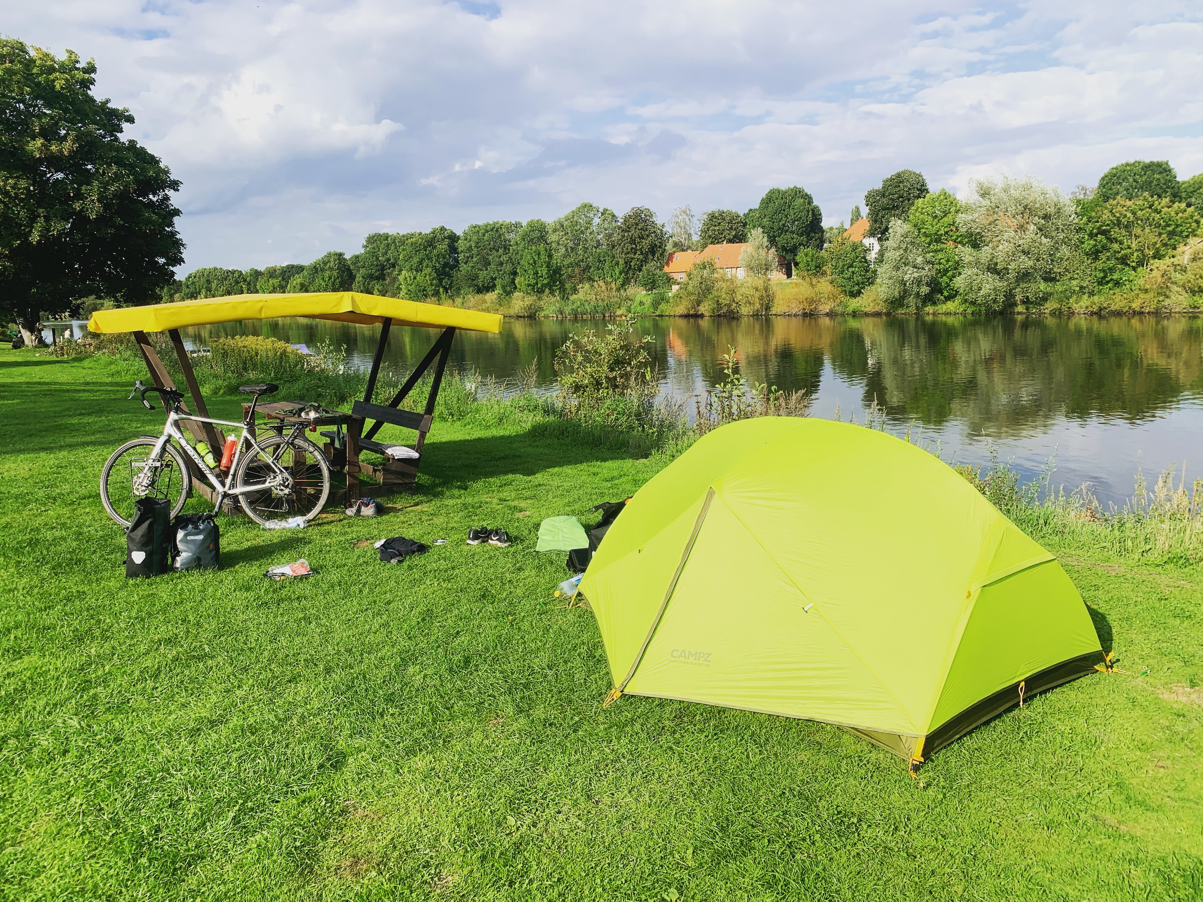 Nu började jag känna att jag borde orka till campingplatsen i Stolzenau. Vilket jag gjorde också. Men först ville Google lura iväg mig på en väg som borde ha lett till campingen. Tyvärr för mig så när jag cyklat nästan 1km på en väldigt dålig grusväg med rätt rejäla potthål visade det sig att någon bestämt sig för att gräva bort hela vägen och ersätta den med ett grustag. Var ju bara att vända hojen för en alternativ väg. Efter 12 mils cykling och med rätt trötta ben var jag inte helt nöjd just då.