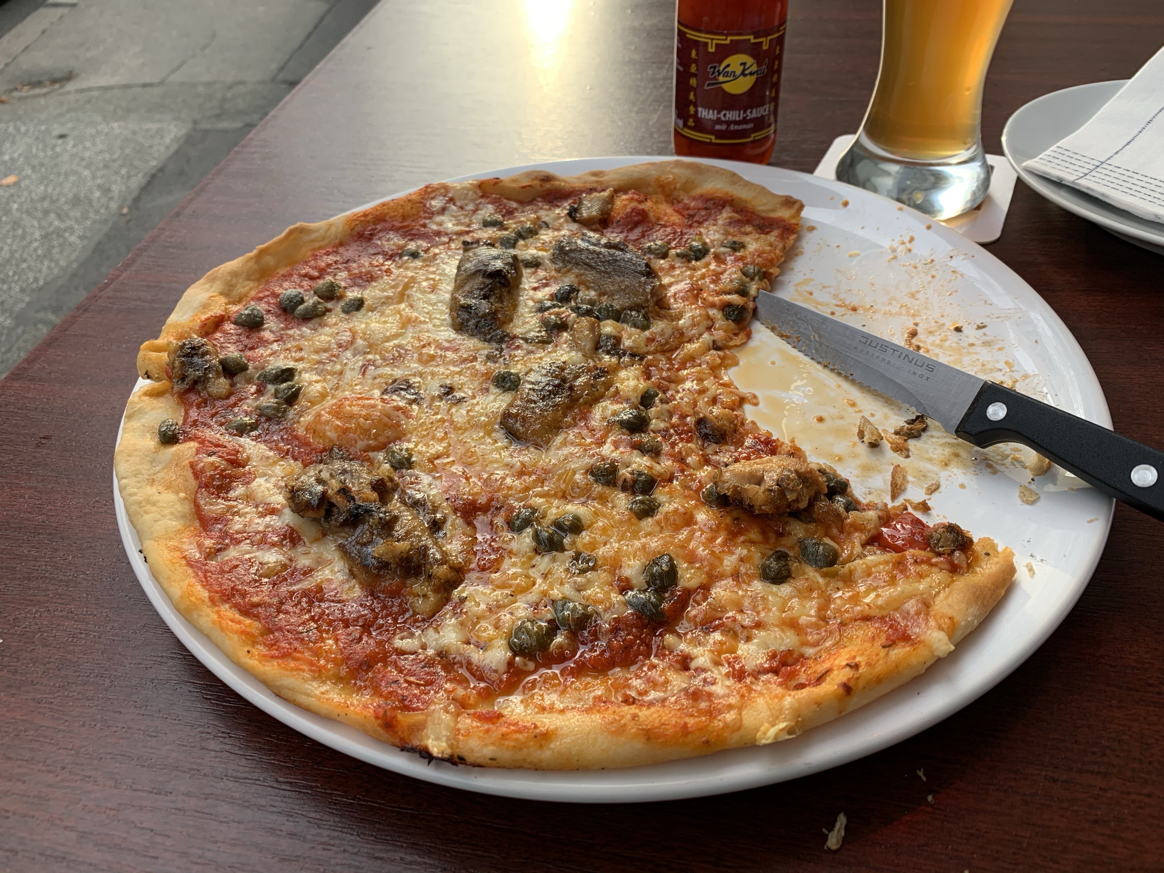 Som nu när jag ätit den kan säga att det var inte värt väntan. Knastertorr deg, smaklös tomatsås, sardeller stors som böcklingar och mängden olja hade gått att rundsmörja cykeln med. Var finns en Billys panpizza när man behöver en?
