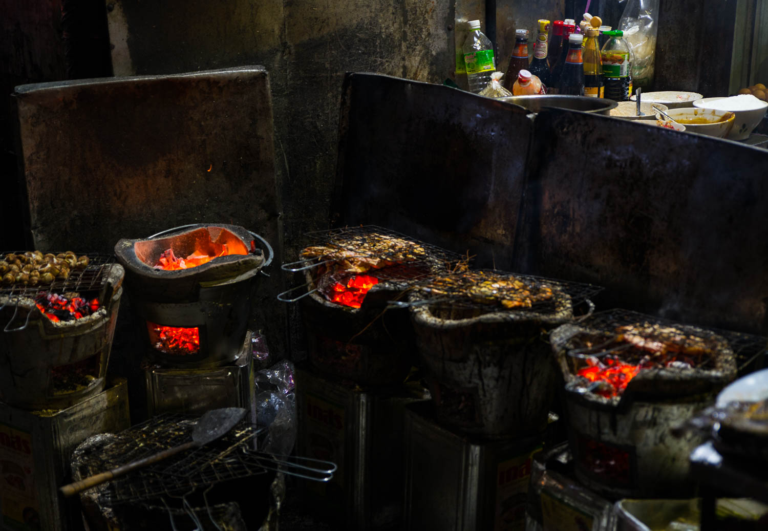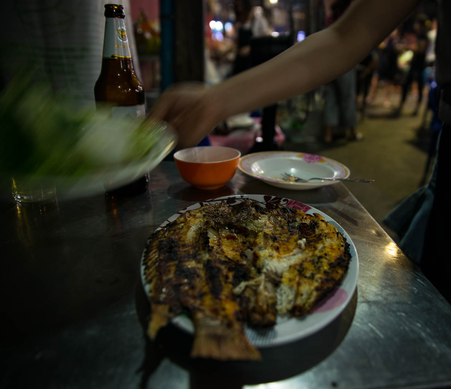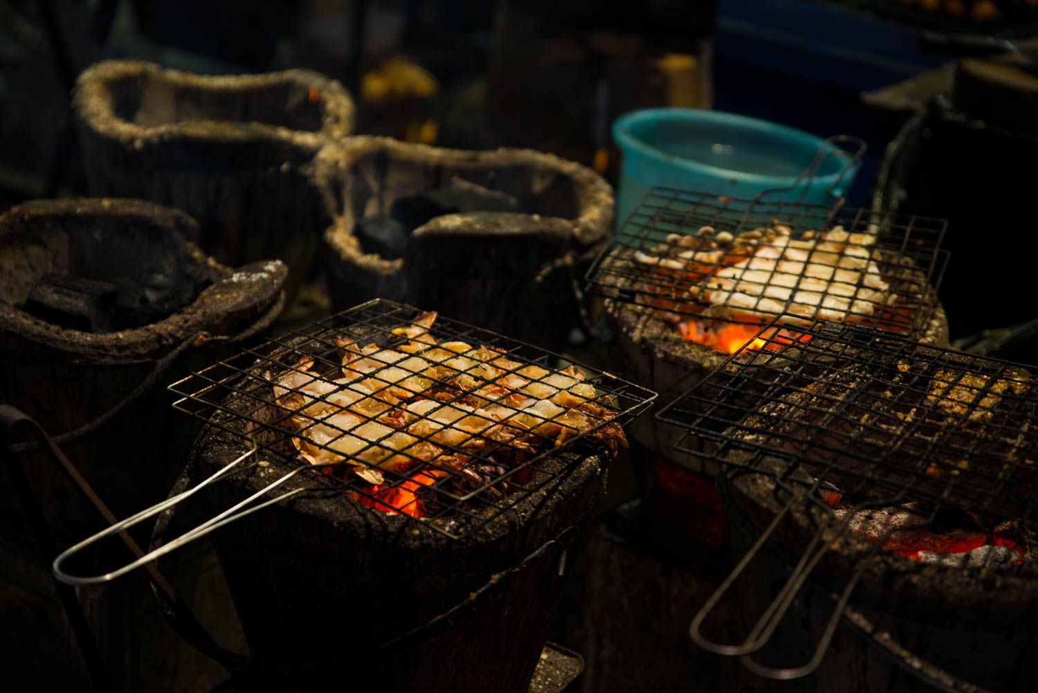 Nåväl, tillslut så kom jag bort från eländet och kunde knalla bort på Sukumvith i riktning mot Ploem Chits Skytrainstation. På andra sidan vägen såg jag två plåtskjul med en massa människor i samtidigt som det kom rök från något som såg ut som grillar. Mat! Klart jag måste gå dit och kolla lite. Stannar ett bra tag och plåtar innan jag blir så hungrig att jag måste beställa in en av de goda fiskar som grillas på de små och välanvända grillarna.