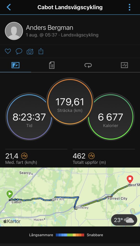 Kom jag fram till Memphis tillslut? Faktiskt inte. Tog in på ett motell efter 180km som passande nog heter Relax Inn. Hade orkat ta mig de sista 55km, men insåg också att det hade blivit lite sent för farbror. Så imorgon blir det lite lugn cykling in till stan. Vilket är tur för då hinner jag shoppa lite nya kläder. Framförallt strumporna börjar se lite trötta ut😂.