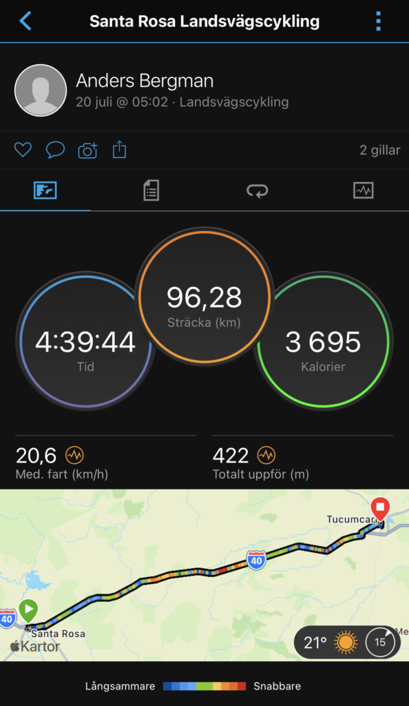Hur gick det då att cykla till Tucamcari idag? Jo, tackar som frågar det gick bra. Dagen bjöd på en blandad kompott av nerför och uppför, men tillslut så var jag ungefär 200m lägre än när jag startade imorse. Tyvärr så har hela dagen tillbringats på I40, vilket är skittråkigt. Morgondagen kommer förhoppningsvis kunna cyklas på den riktiga Route 66. Det var ju liksom det som var tanken med den här resan. Det är 17mil till Amarillo, får se hur vindarna ligger och hur kroppen mår om jag hinner dit innan det blir stekhett ute.