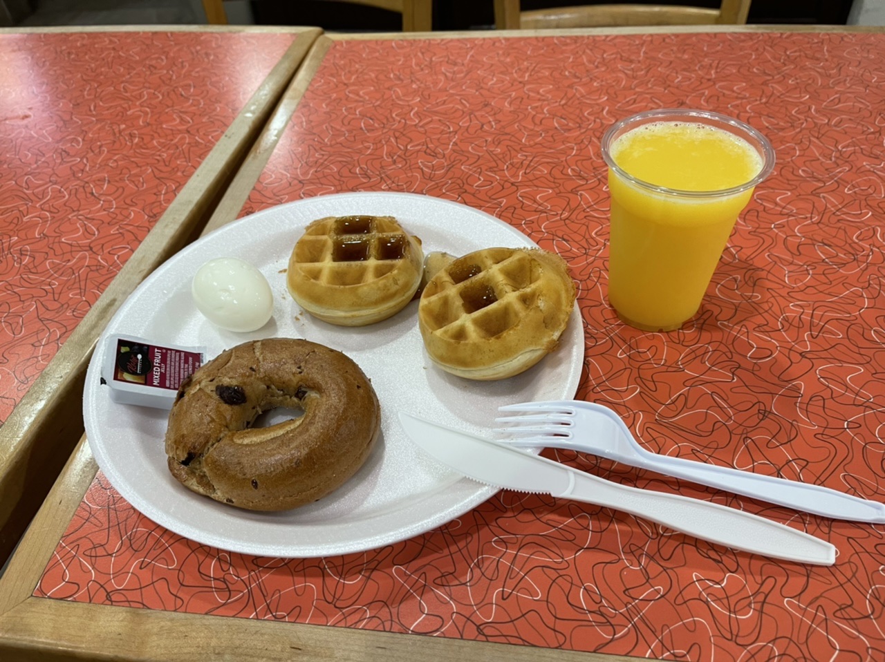 Två våfflor med lönnsirap, en bagel med marmelad samt ett kokt ägg. Allt det goda nersköljt med juice och blaskigt kaffe.