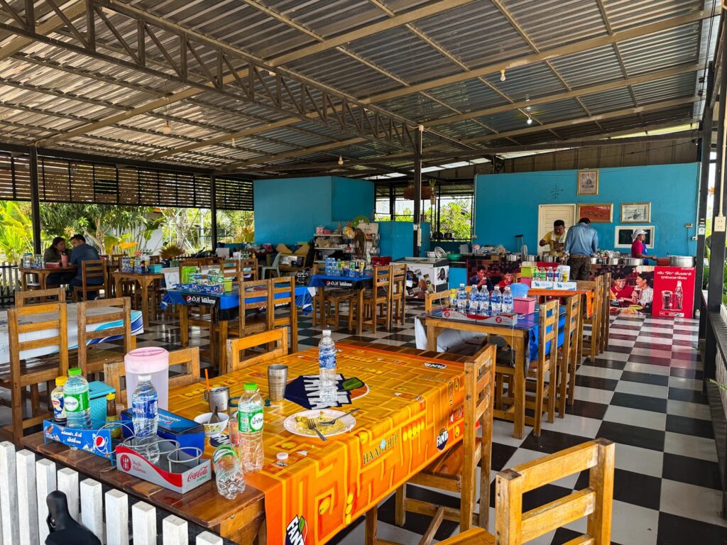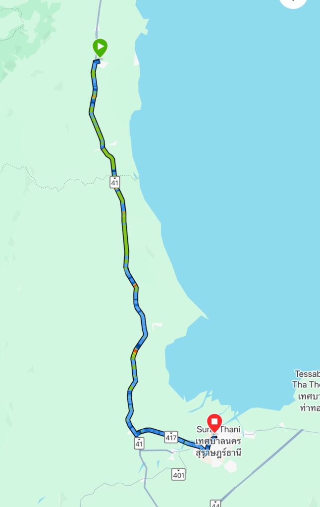 Nu blev det inte direkt en skön och enkel cykeltur. Den mesta tiden av dagen har tillbringats på större tvåfiliga vägar med rätt mycket tung trafik. Först hade jag tänkt att stanna på ett hotell efter drygt nio mil, men det såg då sunkigt ut att jag bestämde mig för att fortsätta till Surat Thani. Stannade till på en ”vägkrog” efter tio mil för en lunch och väldigt, väldigt mycket vatten.