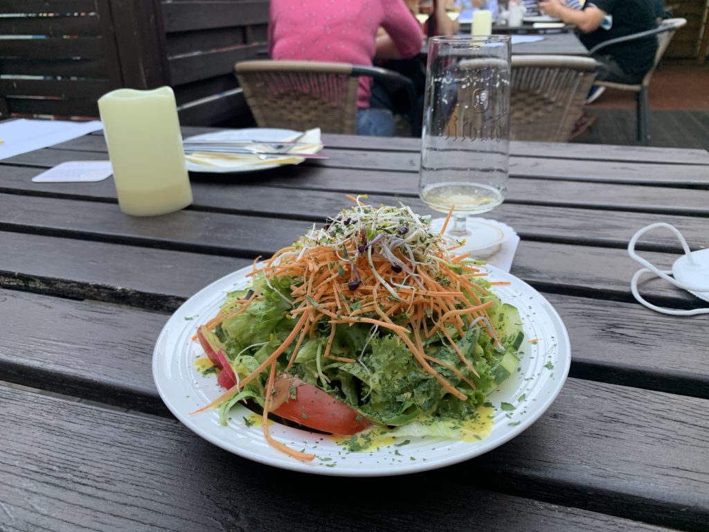 Nu behöver jag inte ens tälta, för Werner låter mig sova i ett uterum. Lyse, ström och en luftmadrass att sova på. Vad mer kan man önska sig? Kanske öl och mat. Efter lån av dusch så gjorde vi sällskap till en traditionell tysk restaurang några hundra meter bort. Efter en rätt lång stund kom så maten in. Tror aldrig jag sett en så stor schnitzel i hela mitt liv. Då ångrade jag att jag smällt i mig salladen innan.