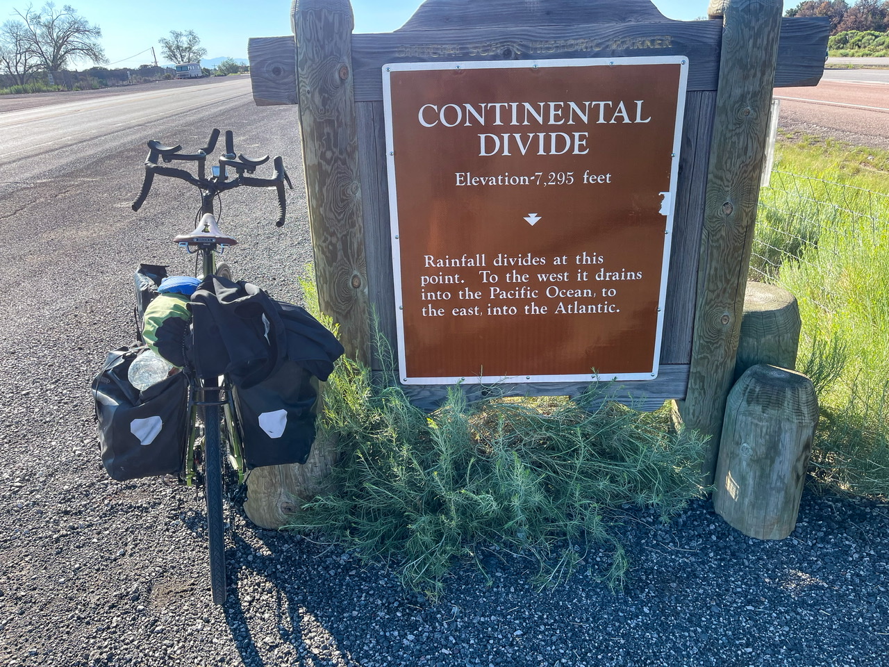 Idag var Färda dum! Hon lurade in mig på en grusväg som gick över ett järnvägsspår och som efter 3km slutade i ett lerdike. Vägen finns på både google och komoot men tyvärr inte i verkligheten. Det var lite som att bila i Spanien, vägen finns på kartan men är tyvärr inte byggd än. Jag hade inget annat val än att cykla tillbaka 5km och ta I40 i 30km tills jag var framme vid The Continental Divide.