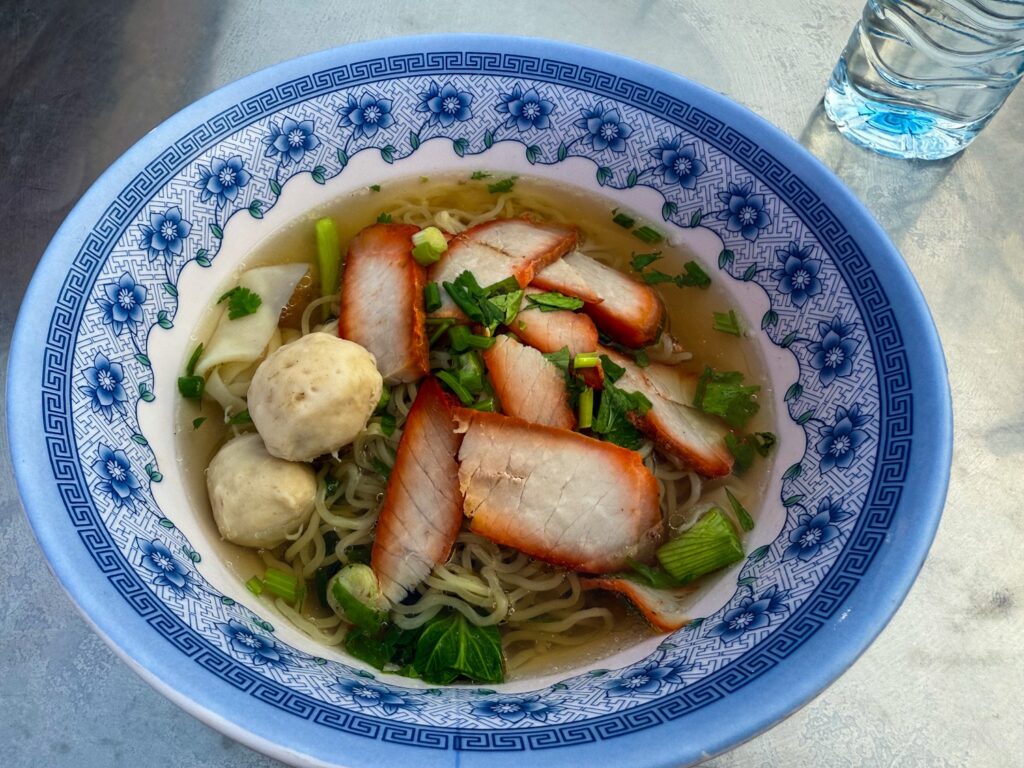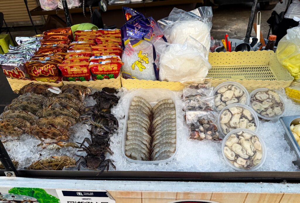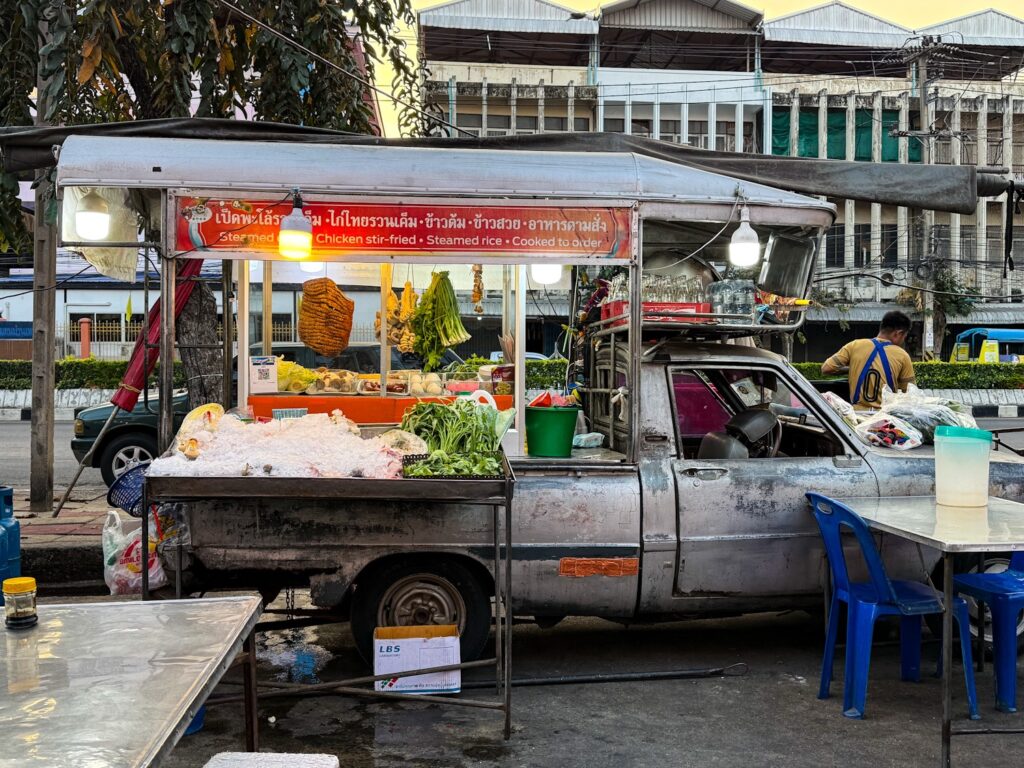 En dag i Thailand är inte komplett utan ett besök på en matmarknad. Vilken tur då att det fanns små matvagnar i stort i varje gathörn. Så middagen intogs sittande på en plastpall vid ett smula ostadigt bord.