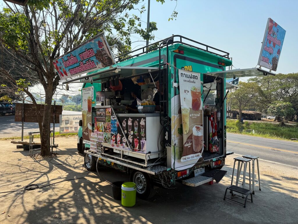 Fyra mil in så stannade jag vid en foodtruck som stod vid sidan av landsvägen och köpte en mangoshake och en kaffe.